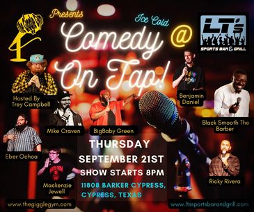 The Giggle Gym is excited to announce a comedy show September 21st at LT’s Sports Bar and Grill, “ The Giggle Gym Presents ”Ice Cold Comedy On Tap“! Show starts at 8:00 PM.