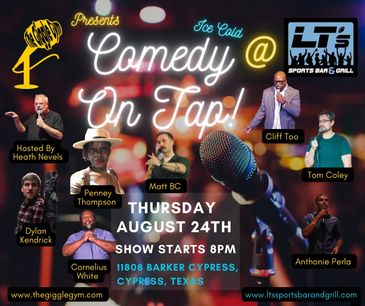The Giggle Gym is excited to announce a comedy show August 24th at LT’s Sports Bar and Grill, “ The Giggle Gym Presents ”Ice Cold Comedy On Tap“! Show starts at 8:00 PM.
