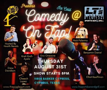 The Giggle Gym is excited to announce a comedy show August 31st at LT’s Sports Bar and Grill, “ The Giggle Gym Presents ”Ice Cold Comedy On Tap“! Show starts at 8:00 PM.
