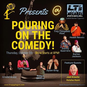 The Giggle Gym is excited to announce a comedy show October 5th at LT’s Sports Bar and Grill, “ The Giggle Gym Presents ”Pouring on the Comedy“! Show starts at 8:00 PM.