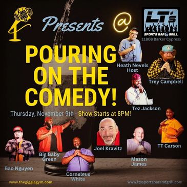 The Giggle Gym is excited to announce a comedy show November 9th at LT’s Sports Bar and Grill, “ The Giggle Gym Presents ”Pouring on the Comedy“! Show starts at 8:00 PM.